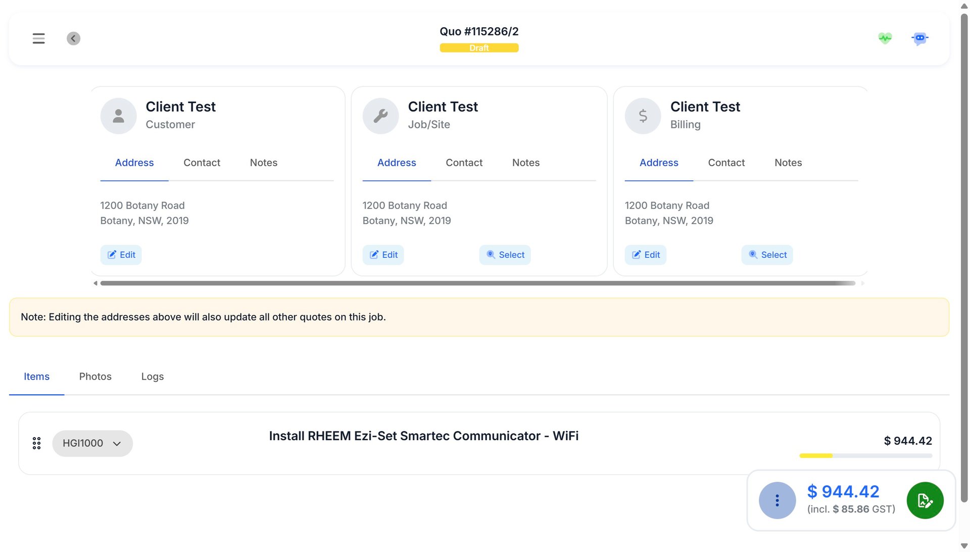 Click Quote Action Menu